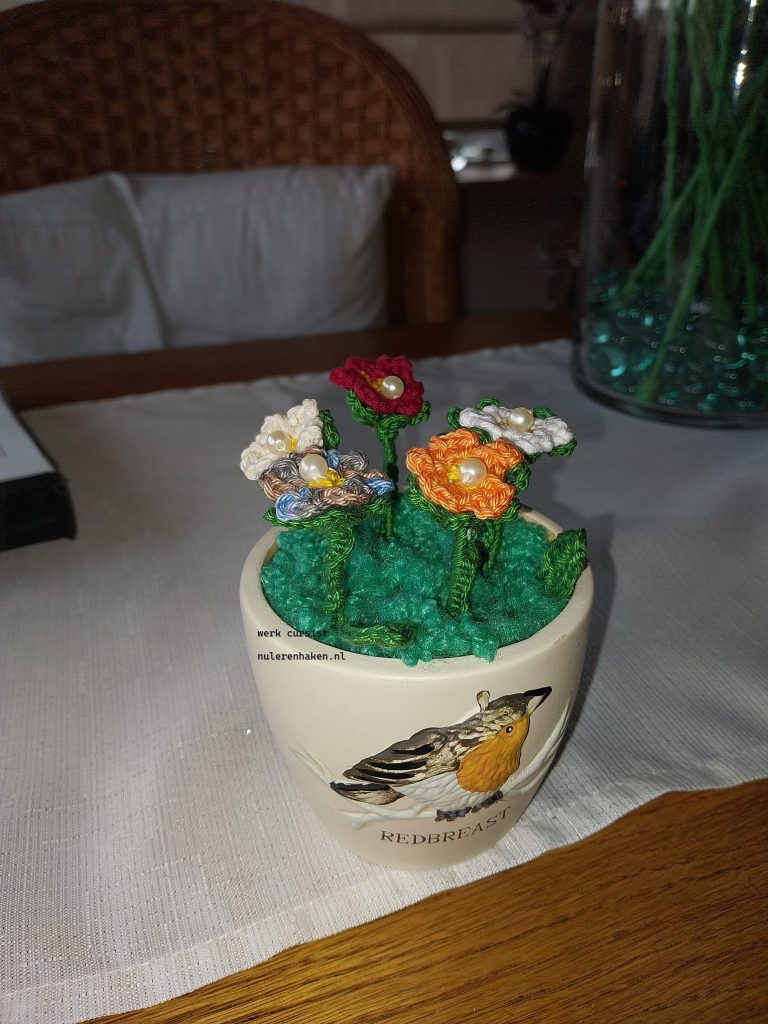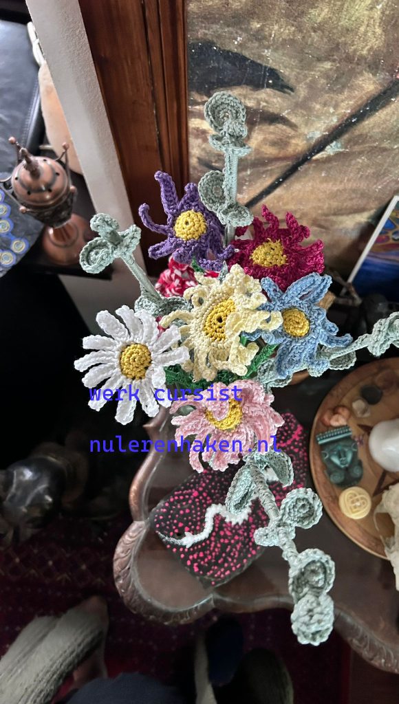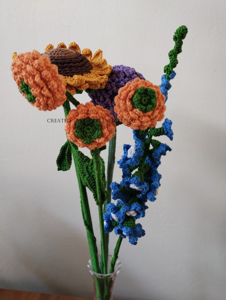 Ook deze zomer is er weer iets wat ik wil maken als cursus voor het volgende seizoen. ik heb gekozen voor een boeket bloemen in de stijl van Vincent van Gogh. De bloemen zijn gehaakt met katoen. De kleuren zijn de van Gogh kleuren uit zijn beroemde schilderij.
